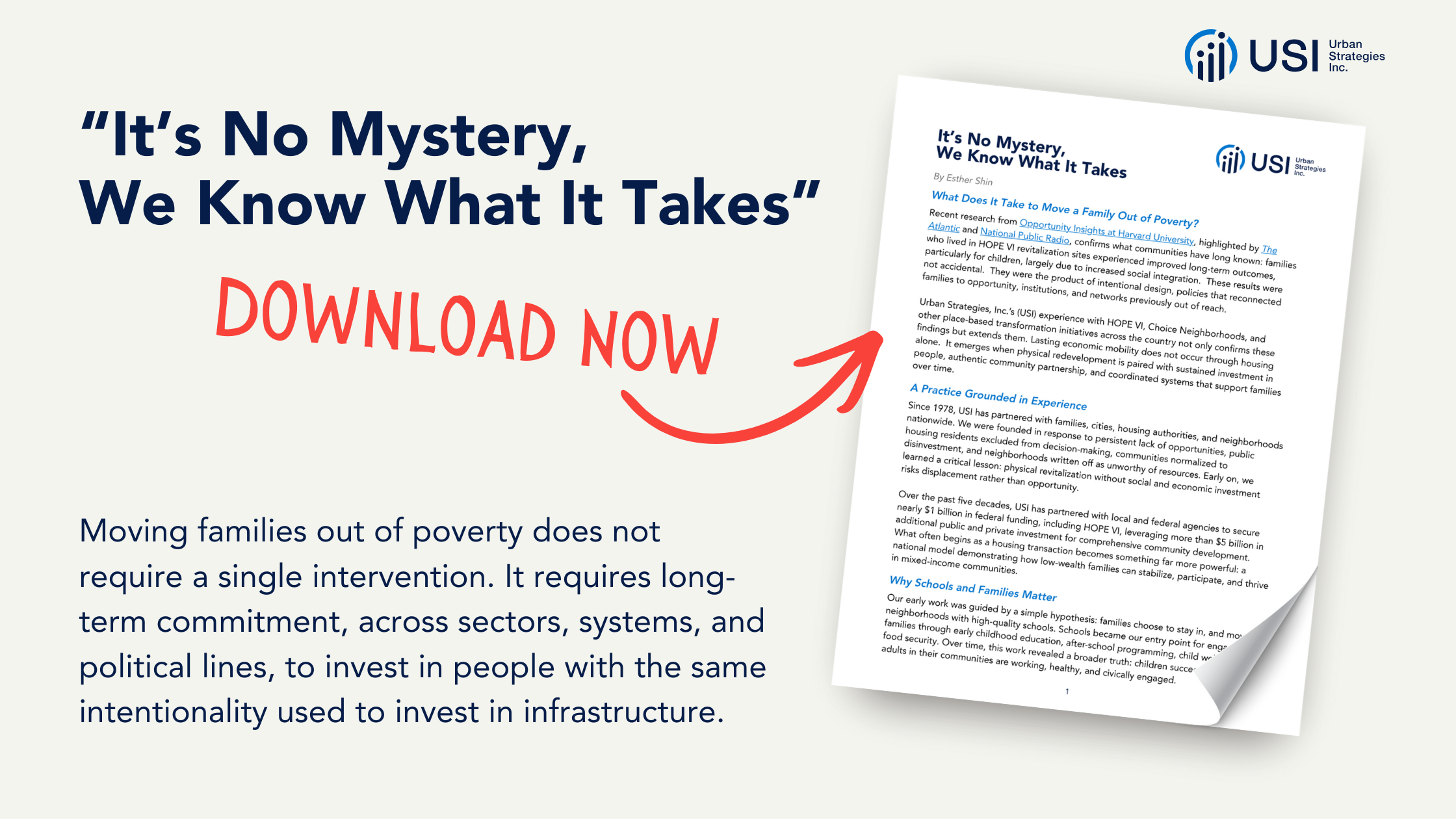 At Urban Strategies, Inc. (USI), we are passionate about creating opportunities for children and families to live stable, productive and prosperous lives.